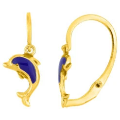 Brillez avec nos boucles d’oreilles en or jaune, ornées de dauphins bleus. Les boucles d’oreilles, accompagnées de leur certificat d’authenticité, sont présentées dans un bel écrin avec un joli sac.