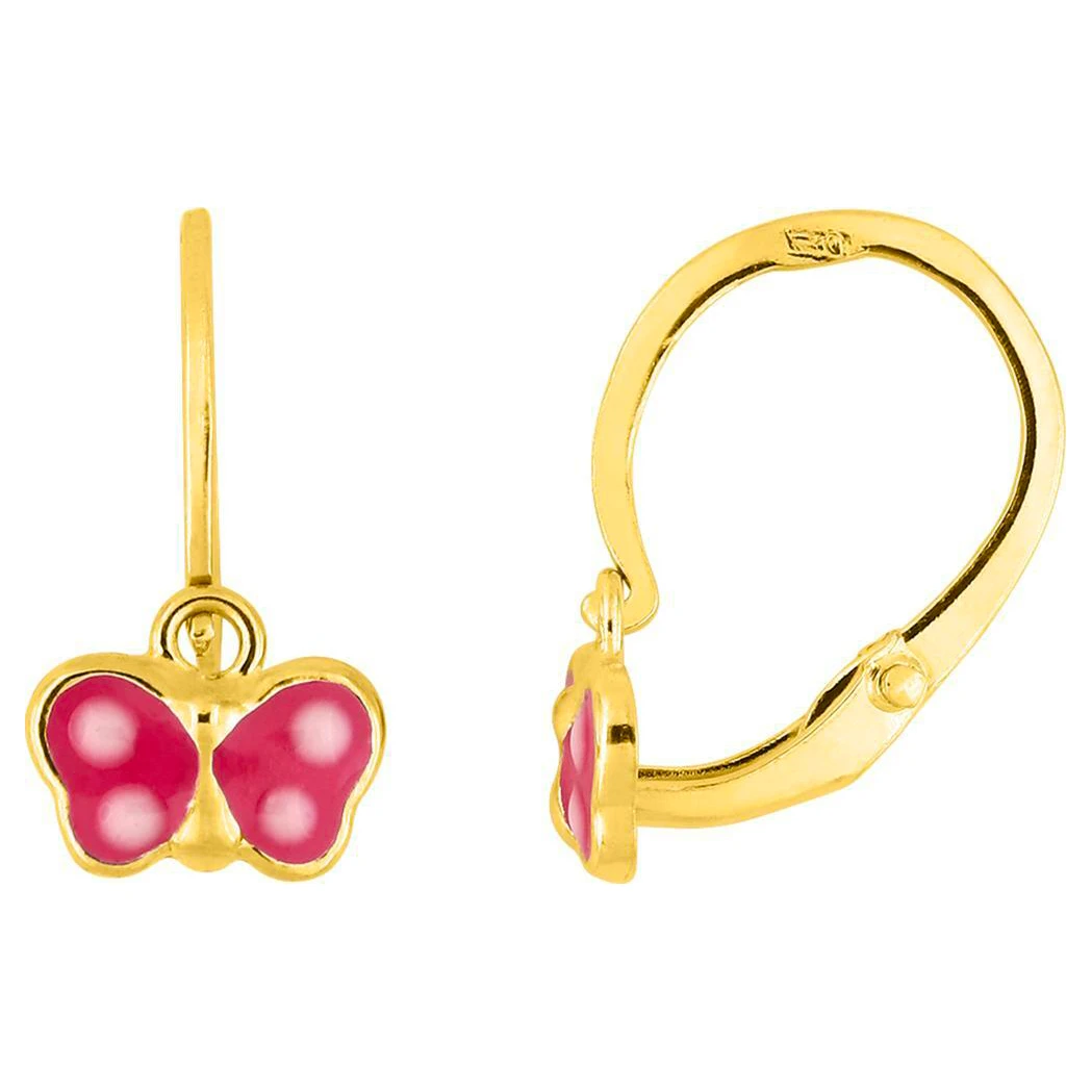 Brillez avec nos boucles d’oreilles en or jaune, ornées de papillons roses à pois blancs. Les boucles d’oreilles, accompagnées de leur certificat d’authenticité, sont présentées dans un bel écrin avec un joli sac.