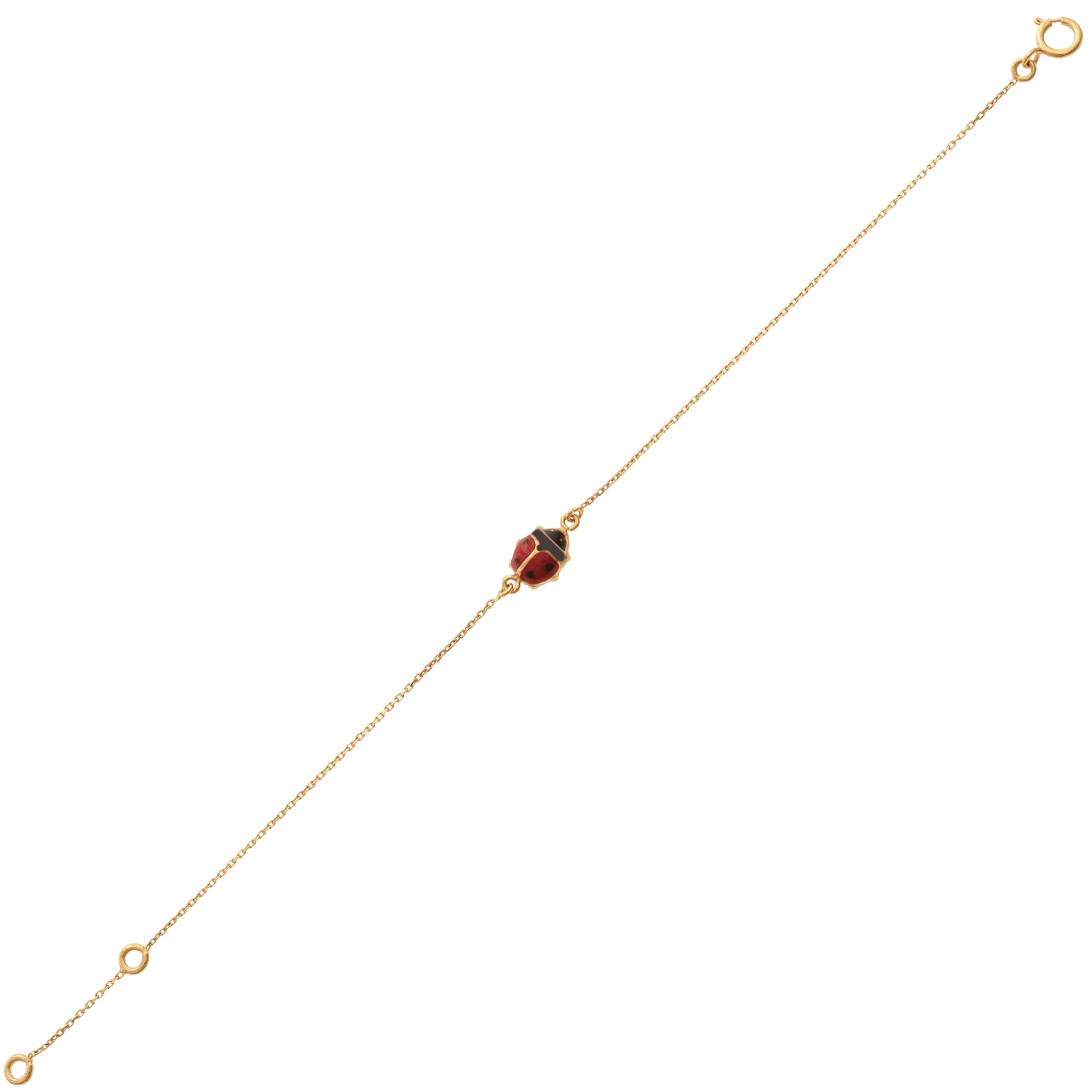Dame coccinelle fait la belle posée sur ce fin bracelet bébé en or jaune et ne semble pas vouloir s’envoler. Superbement laquée de rouge, agréementée de points noirs, cette ravissante bêbête porte-bonheur n’en oublie de rester élégante. Pour une naissance, un baptême ou toute autre grande occasion de la vie, ce ravissant bracelet d’enfant est un cadeau tout trouvé ! Le bracelet a un petit anneau intermédaire à 12,5cm. Ce bracelet, accompagné de son certificat d’authenticité, est présenté dans un bel écrin avec un joli sac.
