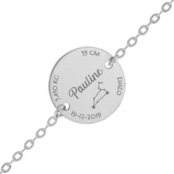 Mieux qu’un acte de naissance, ce magnifique bracelet en or blanc regroupe toutes les informations de naissance de l’enfant. Gravé finement sur le recto, vous trouverez sa date, son heure de naissance, son poids, sa taille, son prénom ainsi que son signe astrologique sous la forme d’une constellation. Ce bijou sera un cadeau sentimental pour fêter une naissance ou un baptême. Modèle déposé . Taille du braceelt : 14cm avec anneau intermédiaire à 12,5cm / Diamètre de la médaille 14mm Le bijou est présenté dans un ravissant petit écrin blanc avec son certificat d’authenticité.