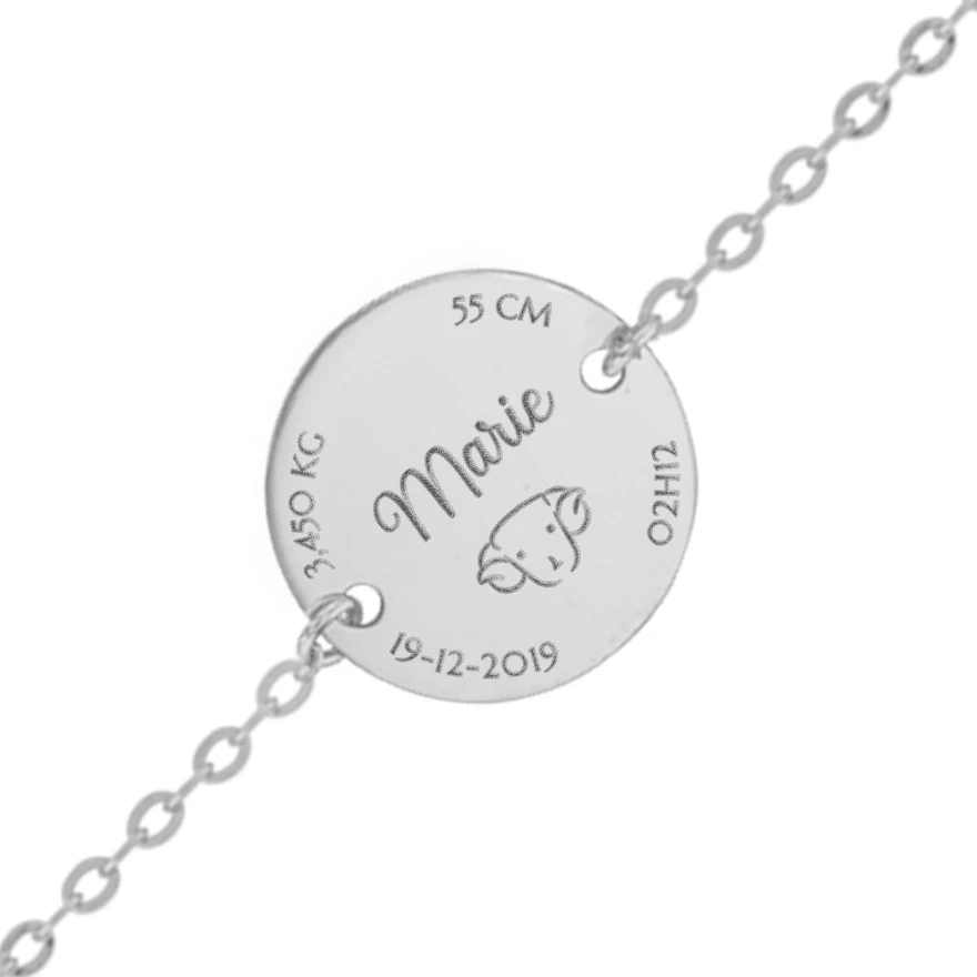 Mieux qu’un acte de naissance, ce magnifique bracelet en or blanc 18 carats regroupe toutes les informations de naissance de l’enfant. Gravé finement sur le recto, vous trouverez sa date, son heure de naissance, son poids, sa taille, son prénom ainsi que son signe astrologique. Ce bijou sera un cadeau sentimental pour fêter une naissance ou un baptême. Modèle déposé . Taille du braceelt : 14cm avec anneau intermédiaire à 12,5cm / Diamètre de la médaille 14mm Le bijou est présenté dans un ravissant petit écrin blanc avec son certificat d’authenticité.