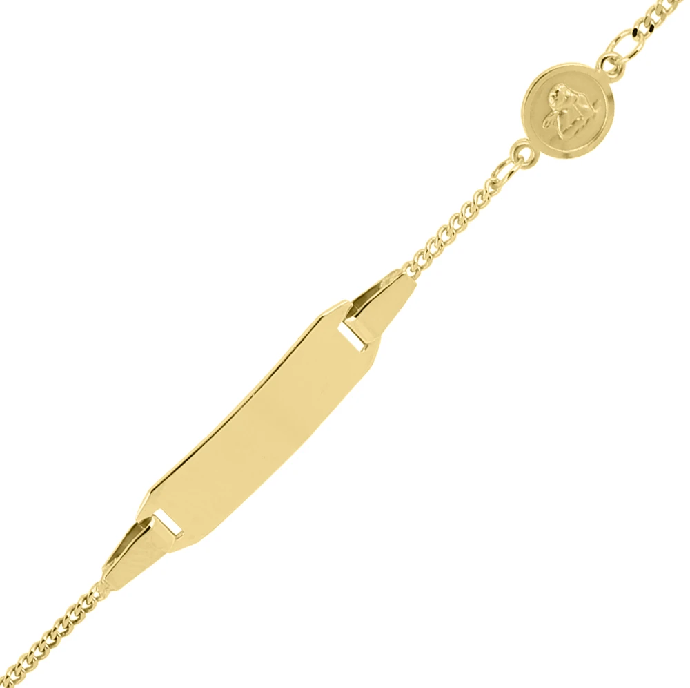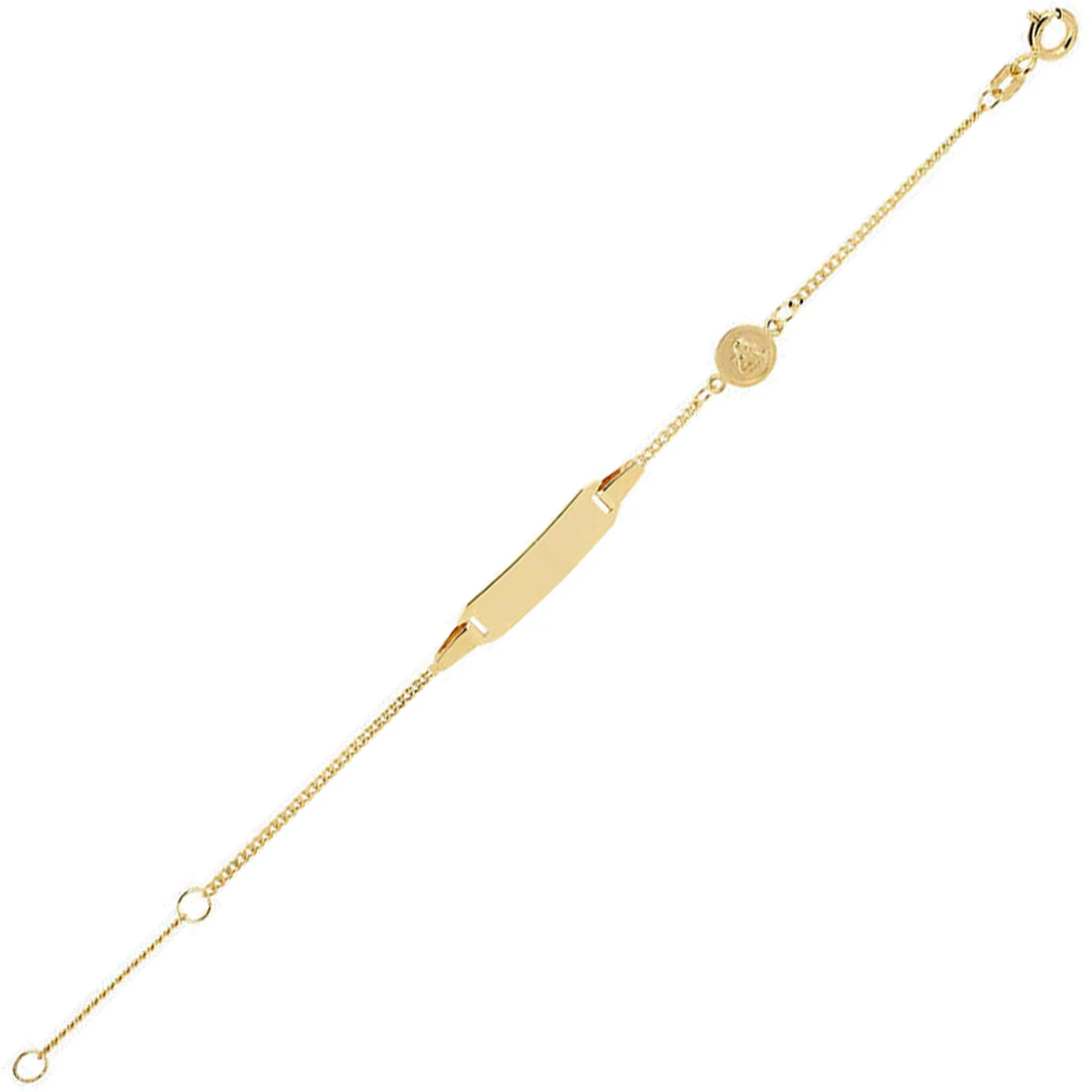 Cette ravissante gourmette bébé conjugue finesse et élégance avec son joli bracelet, sa plaque d’identité et sa mini-médaille intercalée dans la chainette du poignet. Ce détail original et tendance est orné d’un motif » ange « . Réalisée dans un bel or jaune, cette gourmette à offrir pour une naissance ou un baptême peut être personnalisée par la gravure d’un prénom. Dimensions de la plaque: 2cm x 0,5cm. La gourmette, fabriquée en France, mesure 14cm et possède un anneau intermédiaire à 12,5cm. Elle est présentée dans un ravissant petit écrin blanc avec son certificat d’authenticité. Vous pouvez faire graver le prénom de l’enfant au recto et la date de votre choix au verso.