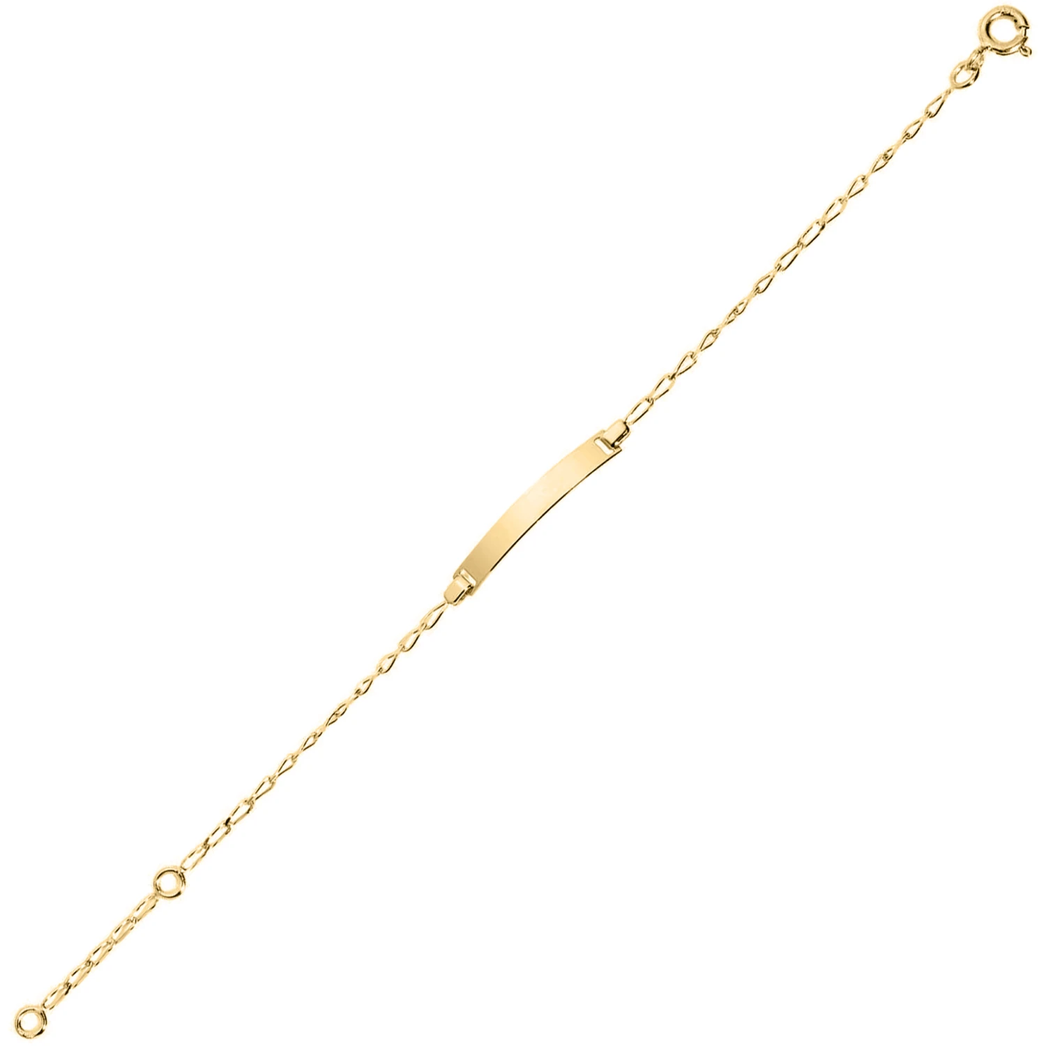 Cette gourmette bébé en or jaune et maille cheval est un modèle de finesse. Faite de boucles plates à la forme allongée, légèrement asymétrique et d’une plaque rectangulaire laissant la place de graver un prénom, elle habillera les poignets les plus délicats. Dimensions de la plaque: 2cm x 0,3cm. La gourmette mesure 14cm et possède un anneau intermédiaire à 12,5cm. Elle est présentée dans un ravissant petit écrin blanc avec son certificat d’authenticité. Vous pouvez faire graver le prénom de l’enfant au recto et la date de votre choix au verso.