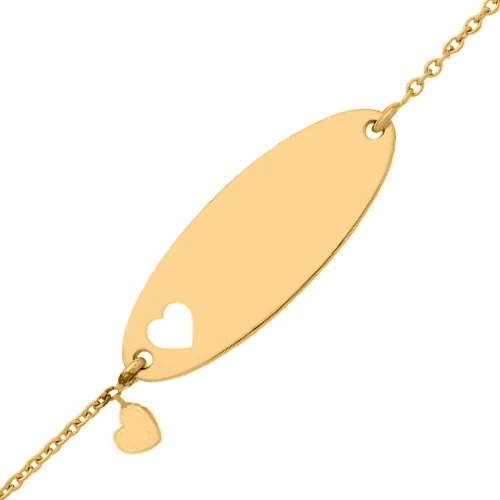 LuluCastagnette vous propose ici une belle gourmette en or jaune. De forme ovale, ce bijou comporte un petit cœur ajouré, symbole universel de l’amour. Un cadeau original pouvant convenir aussi bien à un garçon qu’une fille et qui peut être personnalisé avec le prénom du bébé à qui il est destiné. Modèle déposé . Dimensions de la plaque: 2,5cm x 0,7cm. La gourmette mesure 14cm et possède un anneau intermédiaire à 12,5cm. Vous pouvez faire graver le prénom de l’enfant au recto et la date de votre choix au verso. Elle est présentée dans un ravissant petit écrin blanc avec son certificat d’authenticité.