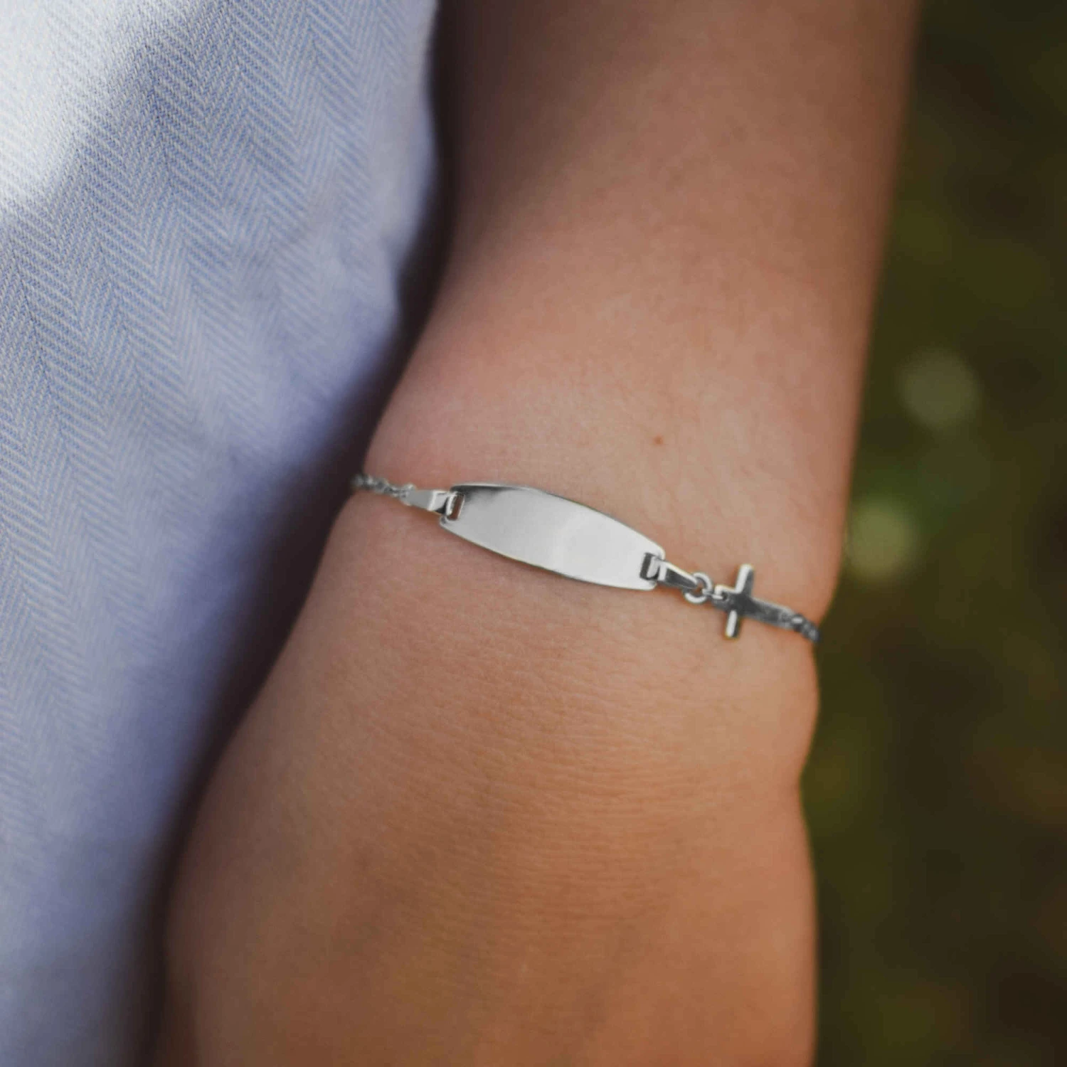 Dans la continuité du bracelet de cette belle gourmette bébé en or blanc, une petite croix rappelle toute la symbolique chrétienne. Entourée d’un fin bracelet la plaque d’identité légèrement ovale n’attend plus que la gravure d’un prénom. Offerte à l’occasion d’une naissance ou d’un baptême , la gourmette bébé pare les petits poignets d’enfants d’une touche d’or des plus chics. Dimensions de la plaque: 1,9cm x 0,7cm. La gourmette, fabriquée en France, mesure 14cm et possède un anneau intermédiaire à 12,5cm. Elle est présentée dans un ravissant petit écrin blanc avec son certificat d’authenticité. Vous pouvez faire graver le prénom de l’enfant au recto et la date de votre choix au verso.