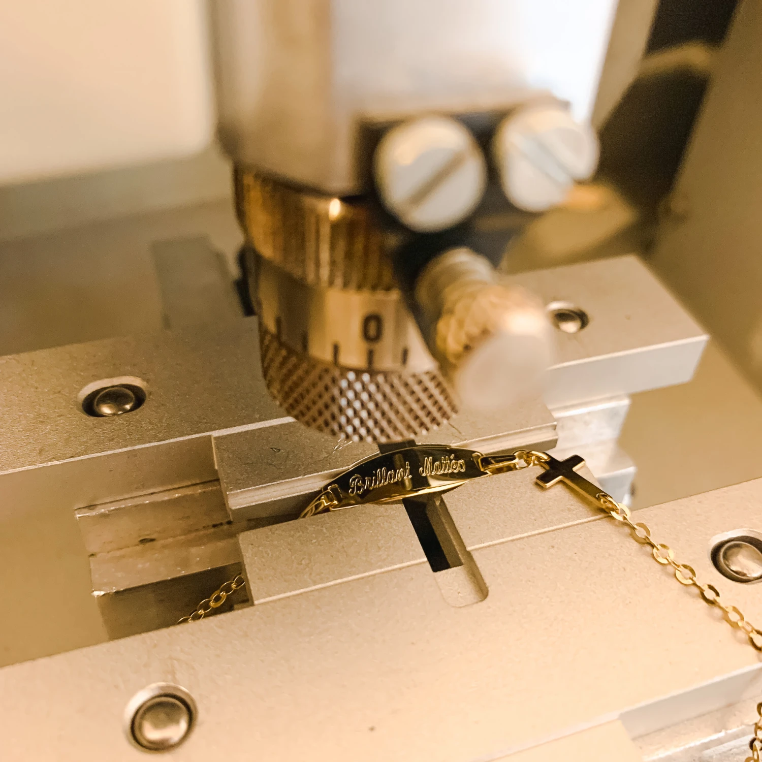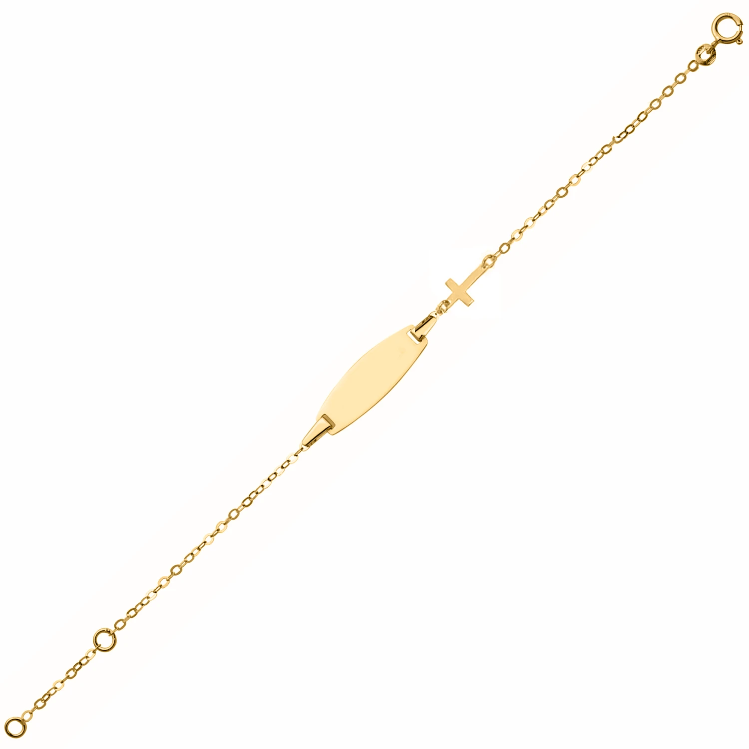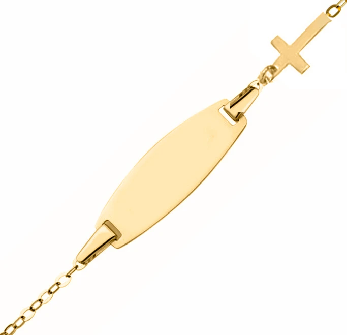 Dans la continuité du bracelet de cette belle gourmette bébé en or jaune 18 carats, une petite croix rappelle toute la symbolique chrétienne. Entourée d’un fin bracelet la plaque d’identité légèrement ovale n’attend plus que la gravure d’un prénom. Offerte à l’occasion d’une naissance ou d’un baptême , la gourmette bébé pare les petits poignets d’enfants d’une touche d’or des plus chics. Dimensions de la plaque: 1,9cm x 0,7cm. La gourmette, fabriquée en France, mesure 14cm et possède un anneau intermédiaire à 12,5cm. Elle est présentée dans un ravissant petit écrin blanc avec son certificat d’authenticité. Vous pouvez faire graver le prénom de l’enfant au recto et la date de votre choix au verso.