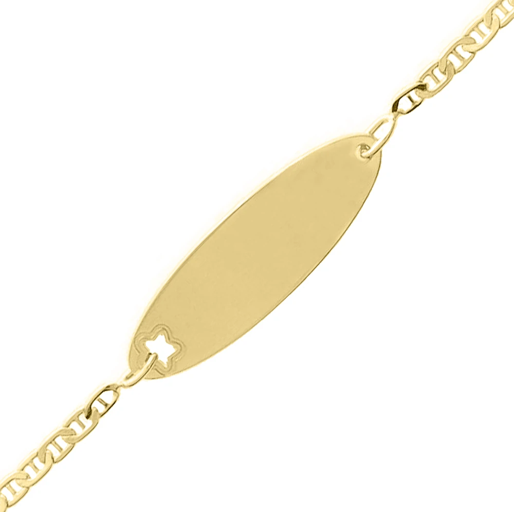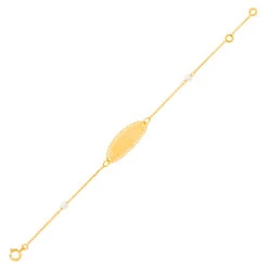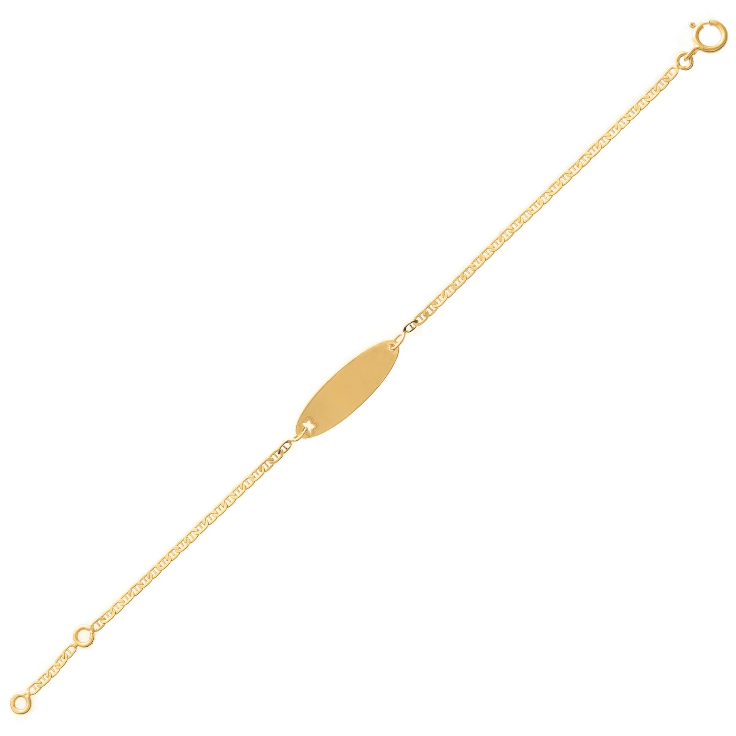 On aime cette gourmette bébé pour son clin d’oeil étoilé et son bracelet original en maille marine. Une petite étoile ajourée veillera sur un prénom d’enfant à graver sur la plaque d’identité ovale de ce ravissant bijou en or jaune. Un beau cadeau pour une naissance ou un baptême. Dimensions de la plaque: 2,1cm x 0,6cm. La gourmette mesure 14cm et possède un anneau intermédiaire à 12,5cm. Elle est présentée dans un ravissant petit écrin blanc avec son certificat d’authenticité. Vous pouvez faire graver le prénom de l’enfant au recto et la date de votre choix au verso.