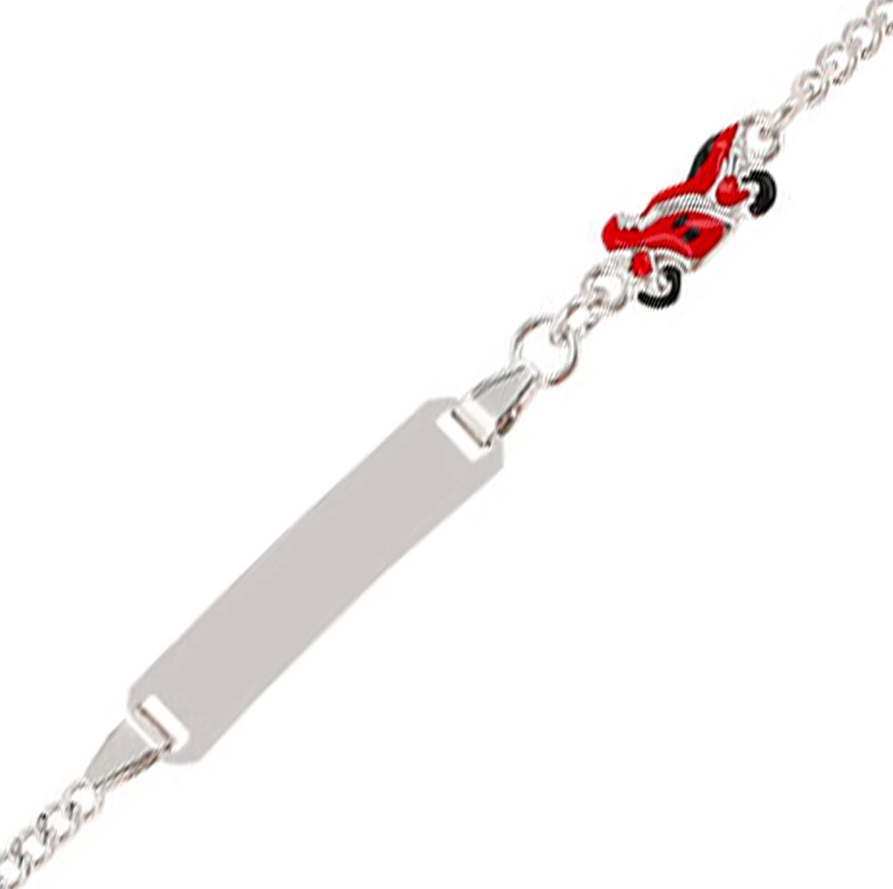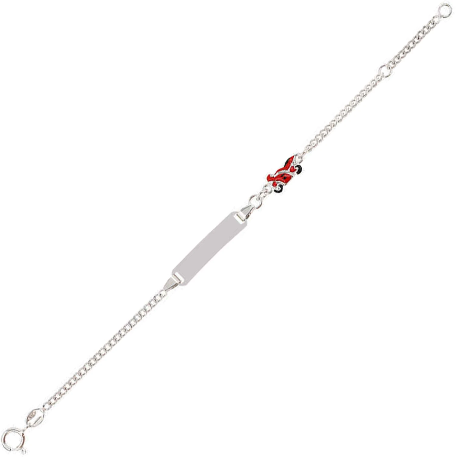 Voici une adorable petite moto, qui ne fait pas de bruit et ne dégage aucun nuage de fumée. Tout simplement décorative avec sa belle couleur rouge, elle décore le bracelet de cette élégante gourmette bébé en argent massif. Cette touche d’originalité donne le ton de ce fin bijou, lui confère un côté très actuel qui suscitera peut-être de futures passions pour ces belles machines. Dimensions de la plaque: 2,2cm x 0,5cm. La gourmette mesure 14cm et possède un anneau intermédiaire à 12,5cm. Elle est présentée dans un ravissant petit écrin blanc avec son certificat d’authenticité. Vous pouvez faire graver le prénom de l’enfant au recto et la date de votre choix au verso.