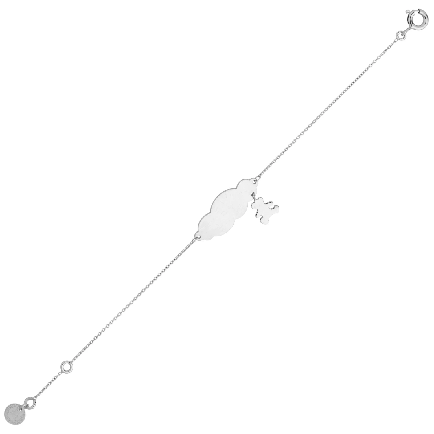 Ce gentil petit ourson aurait-il la tête dans les nuages ? Tout porte à le croire à voir cette gourmette bébé dont la plaque rappelle en tous points un cumulo-nimbus. Simplement accroché par un petit anneau ce gentil petit plantigrade et signature de LuluCastagnette se laisse porter au gré des caprices de la météo. Cette gourmette bébé en argent massif est composée d’un fin mais solide bracelet en maille forçat. Véritable nuage de tendresse, cette gourmette de baptême vous emmène au pays des rêves ! Dimensions de la plaque: 2,4cm x 0,9cm. La gourmette mesure 14cm avec un anneau intermédiaire à 12,5cm. Elle est présentée dans un ravissant petit écrin blanc avec son certificat d’authenticité. Vous pouvez faire graver le prénom de l’enfant au recto et la date de votre choix au verso.