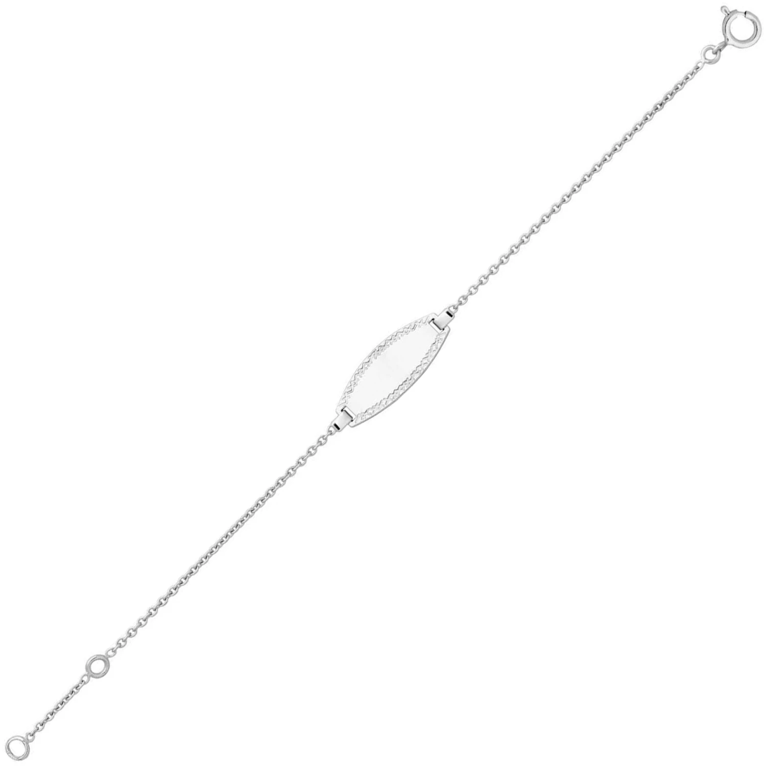 Cette superbe gourmette bébé en or blanc joue les stars avec sa plaque ovale diamantée sur toute sa bordure. Avec son allure un brin rétro, elle illuminera le poignet de l’enfant qui ne se lassera pas de la porter, quelles que soient les circonstances. Dimensions de la plaque: 1,8cm x 0,9cm. La gourmette mesure 14cm et possède un anneau intermédiaire à 12,5cm. Elle est présentée dans un ravissant petit écrin blanc avec son certificat d’authenticité. Vous pouvez faire graver le prénom de l’enfant au recto et la date de votre choix au verso.