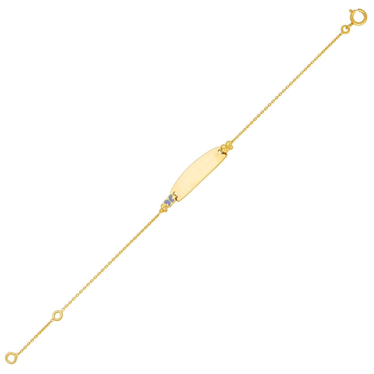 Cette belle gourmette bébé en or jaune annoncerait-elle le printemps ? Tout porte à le croire à voir les petits papillons qui l’accompagnent ! Une jolie et fine plaque de forme ovale, à graver d’un prénom, sert de refuge à ces petits messagers printanniers. Dimensions de la plaque: 2cm x 0,7cm La gourmette mesure 14cm et possède un anneau intermédiaire à 12,5cm. Elle est présentée dans un ravissant petit écrin blanc avec son certificat d’authenticité. Vous pouvez faire graver le prénom de l’enfant au recto et la date de votre choix au verso.