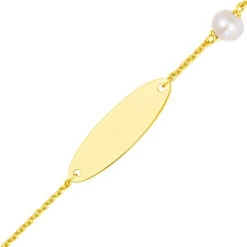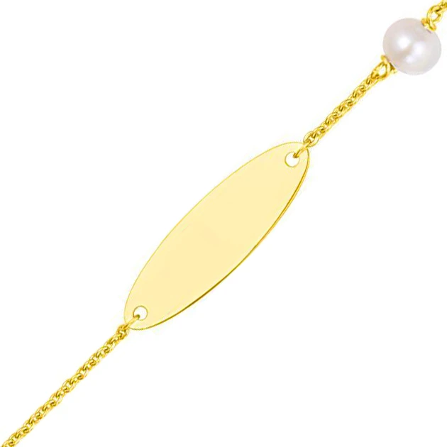 Découvrez cette magnifique gourmette bébé en or jaune. Avec sa petite perle en nacre et sa jolie plaque arrondie elle sera le cadeau idéal pour une petite fille. Ce bijou pourra être personnalisé avec le prénom de votre enfant ainsi qu’une date pour ce souvenir d’un moment inoubliable. Dimensions de la plaque: 1,9cm x 0,7cm. La gourmette mesure 14cm et possède un anneau intermédiaire à 12,5cm. Elle est présentée dans un ravissant petit écrin blanc avec son certificat d’authenticité. Vous pouvez faire graver le prénom de l’enfant au recto et la date de votre choix au verso.