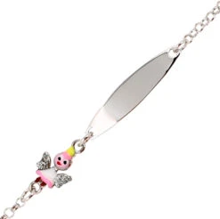 C’est le moment de faire un voeu car cette adorable petite fée semble toute disposée à l’exaucer. Posée de manière originale sur le fin bracelet de cette gourmette en argent massif, elle attend qu’on lui confie quelque petit secret. Personnage clé de l’imaginaire enfantin, la fée est indétrônable et connaît toujours un vif succès ! Dimensions de la plaque: 2,3cm x 0,5cm. La gourmette mesure 14cm et possède un anneau intermédiaire à 12,5cm. Elle est présentée dans un ravissant petit écrin blanc avec son certificat d’authenticité. Vous pouvez faire graver le prénom de l’enfant au recto et la date de votre choix au verso.