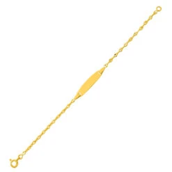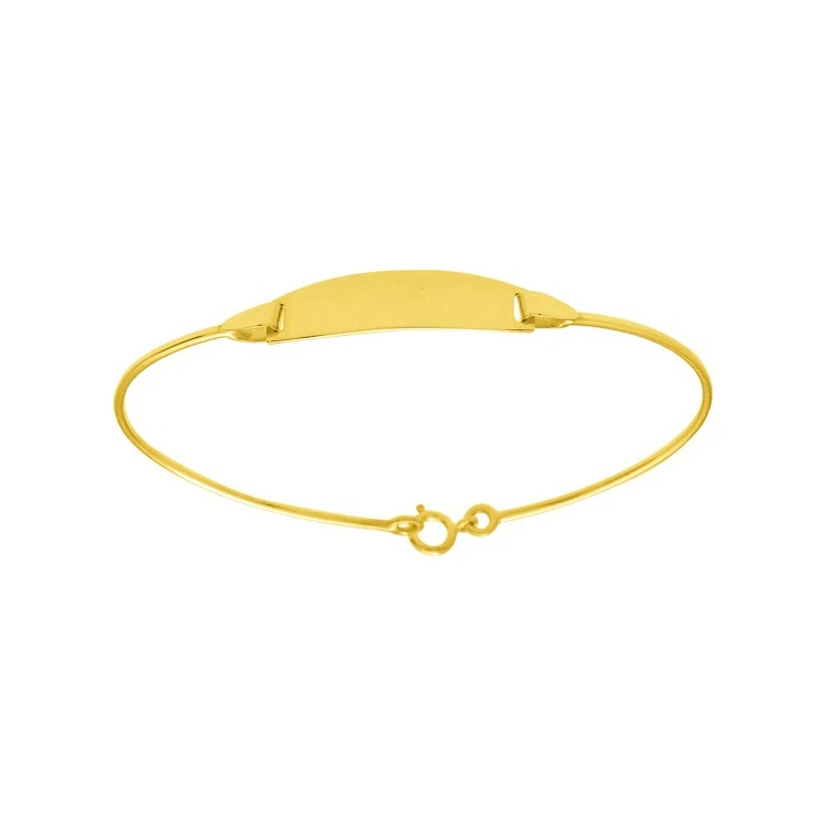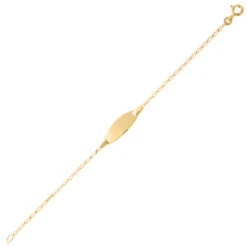 Tout simple mais tellement joli ! Ce bracelet en forme de jonc affiche la tendance des nouvelles gourmettes bébé qui délaisse les maillons classiques au profit de joncs rigides au style très actuel. On n’oublie pas la gravure d’un prénom sur la plaque centrale. Réalisée dans un bel or jaune 9 carats, cette gourmette de baptême a décidément un charme fou ! Le jonc mesure environ 14cm, sa largeur est de 2mm et son diamètre 45mm. Il est présenté dans un ravissant petit écrin blanc avec son certificat d’authenticité. Vous pouvez faire graver le prénom de l’enfant au recto et la date de votre choix au verso.