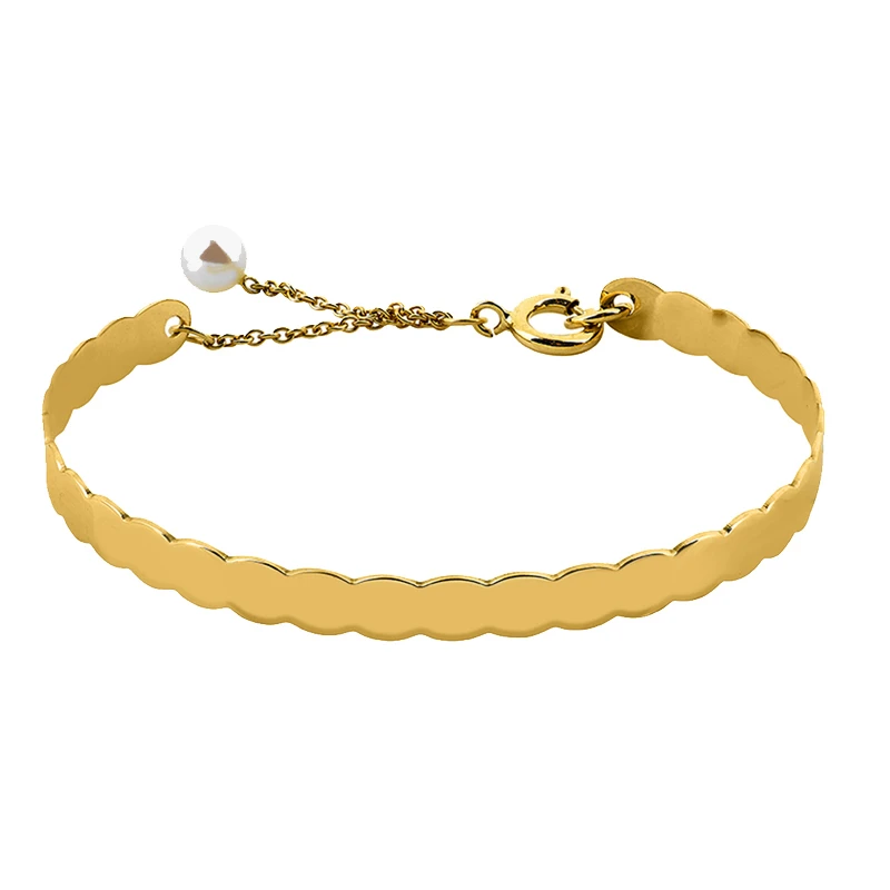 Ce ravissant bracelet pour enfant est un jonc original par ses bords formant de petites ondulations. La fine chaînette qui sécurise sa fermeture est agrémentée d’une perle de culture offrant à ce bijou en or jaune 18 carats une délicate touche d’élégance. Il est présenté dans un ravissant petit écrin blanc avec son certificat d’authenticité. Vous pouvez faire graver le prénom de l’enfant au recto et la date de votre choix au verso.