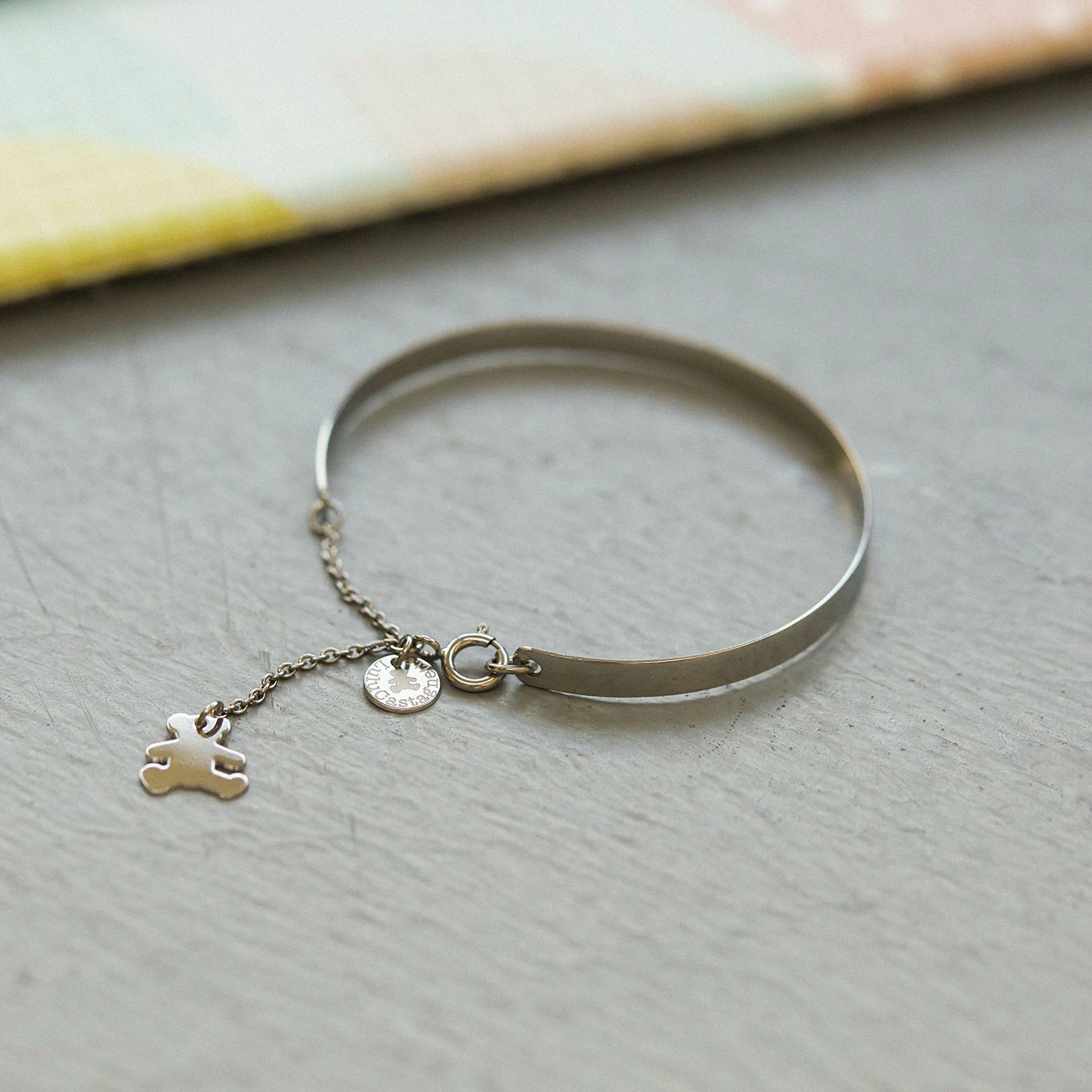 Ce jonc bébé en or blanc est une version très actuelle de la gourmette bébé. Terminée par une délicate chaînette de sûreté, ornée d’un charms ourson et d’une mini médaille frappée du sceau de la marque, cette gourmette a fière allure et affirme son charme moderne. Il est présenté dans un ravissant petit écrin blanc avec son certificat d’authenticité. Vous pouvez faire graver le prénom de l’enfant au recto et la date de votre choix au verso.