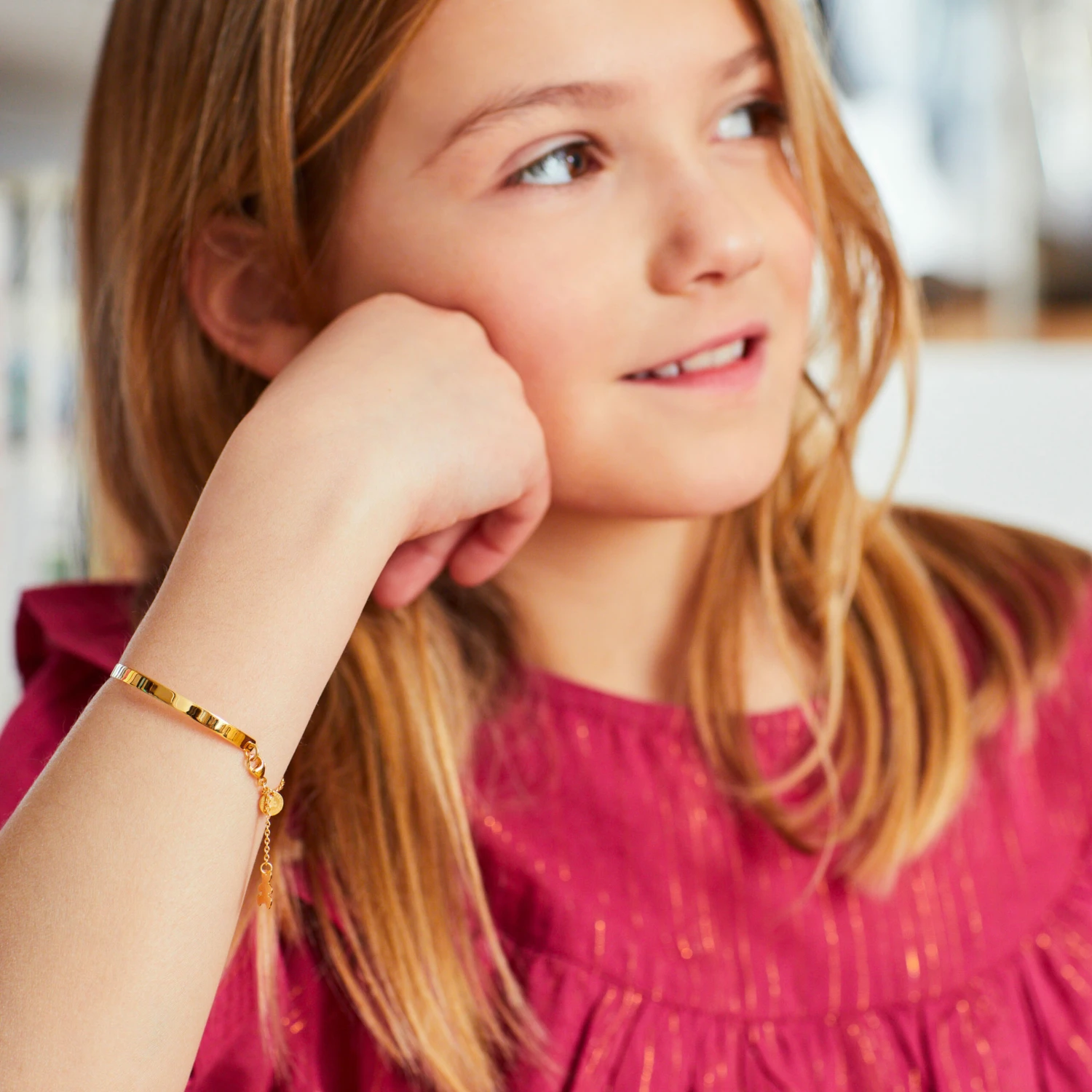 Ce jonc bébé en or jaune est une version très actuelle de la gourmette bébé. Terminée par une délicate chaînette de sûreté, ornée d’un charms ourson et d’une mini médaille frappée du sceau de la marque, cette gourmette a fière allure et affirme son charme moderne. Il est présenté dans un ravissant petit écrin blanc avec son certificat d’authenticité. Vous pouvez faire graver le prénom de l’enfant au recto et la date de votre choix au verso.