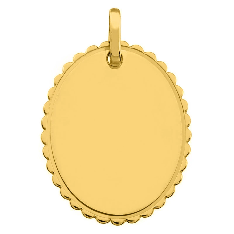 Avec son petit air rétro, ce pendentif en or jaune ne manque pas de charme. Sa forme ovale, sa bordure festonnée rappellent les pendentifs d’antan. Il ne manque qu’une chose… mais laquelle? Certainement la gravure du prénom de l’enfant qui recevra ce ravissant bijou en cadeau! Ce pendentif, accompagné de son certificat d’authenticité, est présenté dans un bel écrin avec un joli sac. Notre artisan peut personnaliser ce pendentif, à vous de choisir l’emplacement de la gravure.