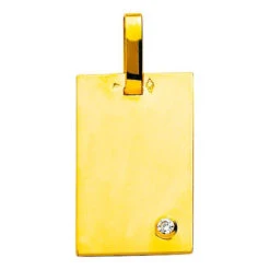 Ce pendentif en or affiche son originalité en intégrant un diamant serti qui termine ce joli bijou de la manière la plus élégante et glamour qui soit. Vous n’oublierez pas de la faire graver pour l’offrir à un enfant ou à un adulte pour marquer un évènement particulier. Dimensions : 25x15mm. Diamant de 0,04 carats. Ce pendentif, accompagné de son certificat d’authenticité, est présenté dans un bel écrin avec un joli sac. Notre artisan peut personnaliser ce pendentif, à vous de choisir l’emplacement de la gravure.