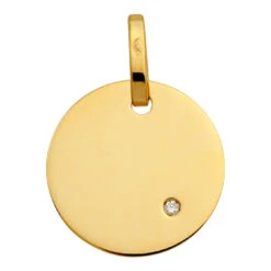 On dit souvent que les bijoux les plus simples et les plus sobres sont souvent les plus beaux. On peut aisément le constater en regardant cette médaille ronde en or jaune poli et brillant. Une petite touche de fantaisie est pourtant venue s’inviter sur ce joli jeton aussi lumineux qu’un soleil. Une gravure viendra terminer ce ravissant bijou, prêt à être offert à l’occasion d’une naissance, d’un baptême ou d’un anniversaire. Diamant de 0,01 carat. Ce pendentif, accompagné de son certificat d’authenticité, est présenté dans un bel écrin avec un joli sac. Notre artisan peut personnaliser ce pendentif, à vous de choisir l’emplacement de la gravure.